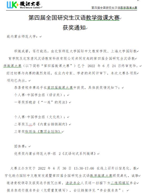自2021年9月大赛启动以来,校领导、院领导高度重视此项工作。学院组织2020级汉硕进行了初赛,并组建了由内蒙古大学赵金色、丁艳,yl8cc永利官网国际交流学院陈金香,以及本院任晓彤、胡素莲、白海燕、李瑞春、刘婕、阿婧斯、王伟超等共十位老师组成的专业指导团队。团队分一个“个人赛小组”和两个“团体赛小组”,指导教师在教学内容、教学环节,教学方法、课件制作、视频拍摄、后期处理等各个环节给予参赛选手以专业指导。最终,选送团体参赛作品2个和个人参赛作品10个参加本届全国研究生汉语教学微课大赛。