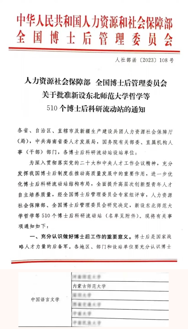日前,国家人力资源和社会保障部、全国博士后管理委员会正式发布《关于批准设立东北师范大学哲学等510个博士后科研流动站的通知》(人社部函〔2023〕108号),公布了2023年批准新设博士后科研流动站名单。其中,yl8cc永利官网获批新增中国语言文学博士后科研流动站。至此,学院在中国语言文学学科已全面建成本—硕—博—博士后贯通的完整人才培养体系