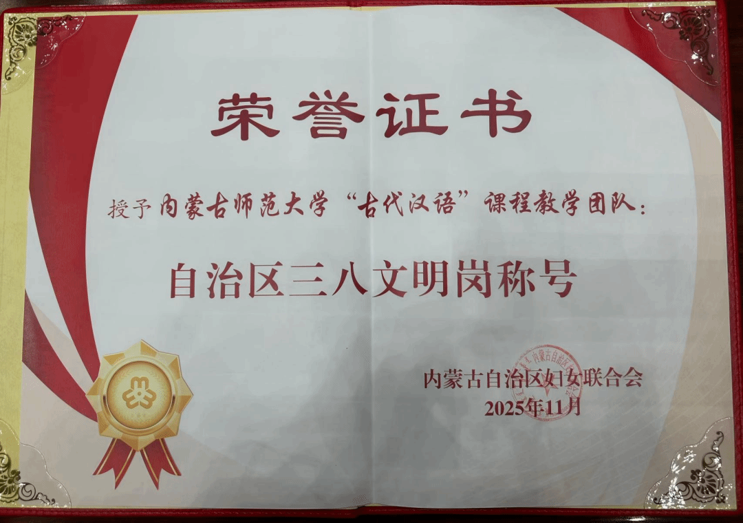 2025年12月31日上午,自治区三八红旗手(标兵、集体)、自治区三八文明岗表彰大会召开。会议授予15人“自治区三八红旗手标兵”称号,授予200人“自治区三八红旗手”称号,授予149个单位“自治区三八红旗集体”称号,授予200个单位“自治区三八文明岗”称号。yl8cc永利官网“古代汉语”课程教学团队荣获“自治区三八文明岗”荣誉称号。