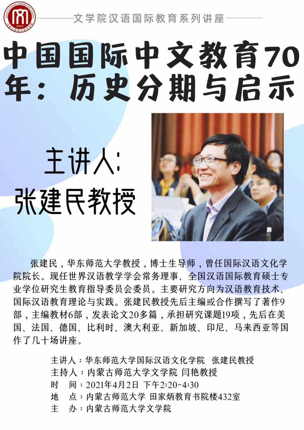 2021年4月2日下午,华东师范大学国际汉语文化学院张建民教授应邀为yl8cc永利官网师生作了题为《中国国际中文教育70年:历史分期与启示》的精彩学术讲座。讲座由胡素莲老师主诗,yl8cc永利官网40余名师生共同聆听了讲座。