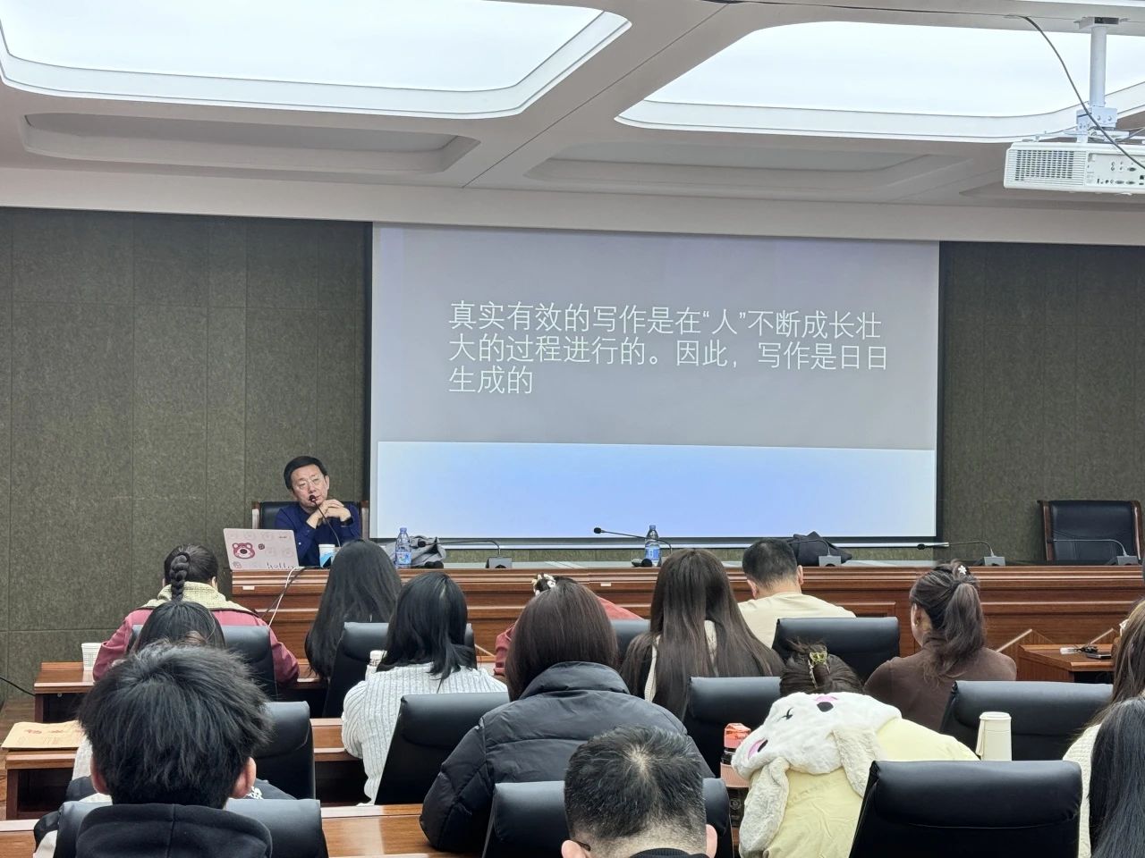 2024年11月23日上午,北京市特级教师,中国语文报刊协会写作教学专业委员会副理事长,中国教育学会“领航计划”专家连中国老师,为yl8cc永利官网师生作了题为“写作:人的完整即文的完整”的讲座。讲座由陆有富教授主持,相关专业教师和研究生聆听了讲座。