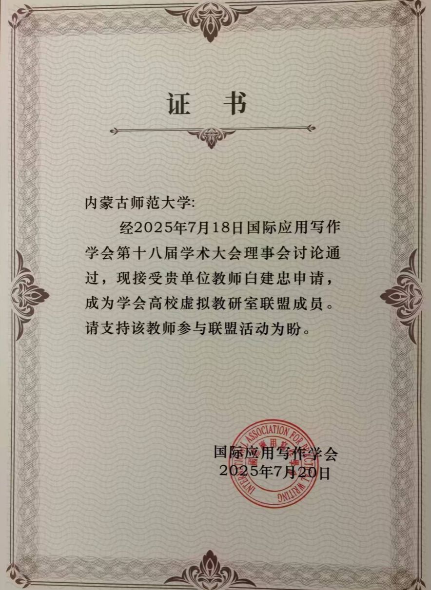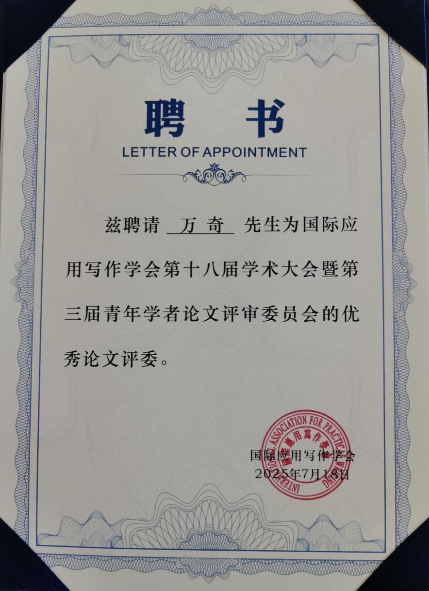 yl8cc永利官网万奇教授、白建忠教授应邀参加了本次研讨会。万奇教授作为国际应用写作学会的副会长,作了题为《论礼仪文书写作课的教学之道与教学之术》的主题学术报告。万奇教授被聘为本次会议论文评审委员会的优秀评委,并且作为第四分会场的学术观察员,对本组的论文作了精彩的点评。白建忠教授在自由发言阶段作了题为《明代章奏之体的演变》的学术报告。在本次会议上,yl8cc永利官网的写作教研室成为国际应用写作学会高校虚拟教研室联盟成员。