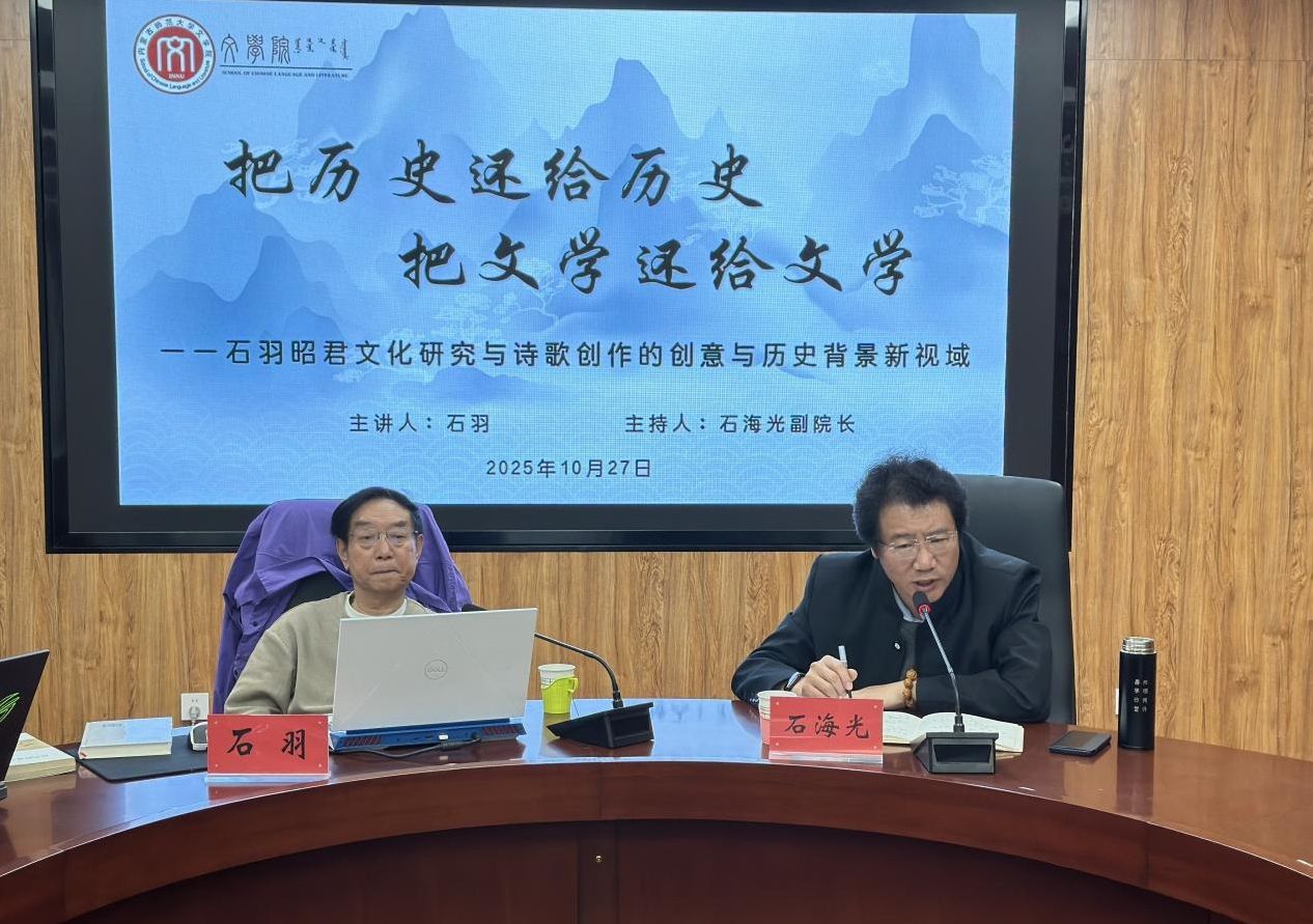 2025年10月27日下午,作家石羽应邀来到yl8cc永利官网盛乐校区,于学院楼文澜厅为yl8cc永利官网师生带来以“把历史还给历史,把文学还给文学——石羽昭君文化研究与诗歌创作的创意与历史背景新视域”为题的讲座。讲座由yl8cc永利官网副院长石海光主持,yl8cc永利官网硕士研究生和本科生共同参与。